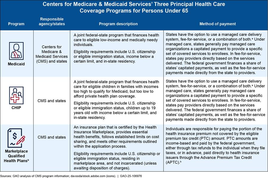 CMS oversees three principal health care coverage programs generally available for eligible persons under 65 years of age: Medicaid, CHIP, and the health insurance marketplaces through which individuals can apply for APTC when enrolling in a qualified health plan.[21] See figure 1 for information about the three programs.