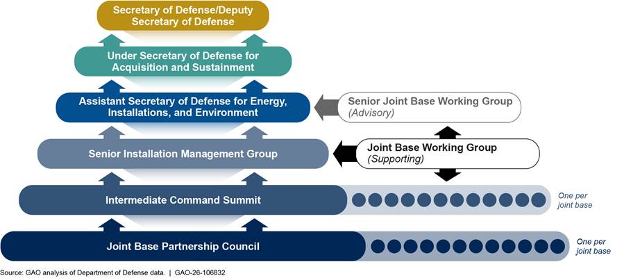 In January 2008, the Deputy Secretary of Defense issued guidance to implement the joint basing initiative.[9] The guidance required that the military services at each joint base enter into an MOA to define the relationships between the components; to detail the transfer of real property and funding to the lead component; and to require the establishment of the Joint Base Partnership Council, which is a group consisting of representation from the major supported component(s) and the tenants on the base. The council’s role includes helping at the joint base level to resolve any disputes that arise between the lead and supported components.[10] Further, the guidance also created a Joint Management Oversight Structure to establish the lines of authority for handling disputes and directed the transfer of installation-support authority and real property to the lead component (see fig. 2). Each level of this oversight structure is required to complete reviews of changes to a joint base MOA within a specified time frame. If the changes under review cannot be resolved by the oversight structure, the changes are to be adjudicated by the Assistant Secretary of Defense for Energy, Installations, and Environment. DOD’s July 2025 instruction retained the same governance structure for joint bases.[11]