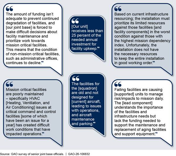 The Department of Defense (DOD) has faced challenges in keeping facilities on installations in good working order. However, senior DOD officials have testified to Congress that the department has chosen to accept risk by investing less in facilities than what DOD had determined was needed to effectively sustain them, and other officials have stated that funding priority is given to other programs and initiatives, such as weapon system acquisitions.[1] More recently, in March 2025, DOD notified Congress that the Army plans to move at least $1 billion from facilities sustainment funding to other programs. DOD consolidated 26 installations into 12 joint bases over a decade ago to increase readiness and to generate cost savings and efficiencies. Facility management is more complicated at DOD’s 12 joint bases, because the lead military service is also responsible for providing installation support to other military services’ facilities on the installation.[2] A 2021 DOD Inspector General audit of joint bases found that managing facility investments was one of the most challenging and longest-standing issues with joint base implementation.[3]