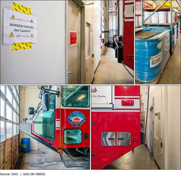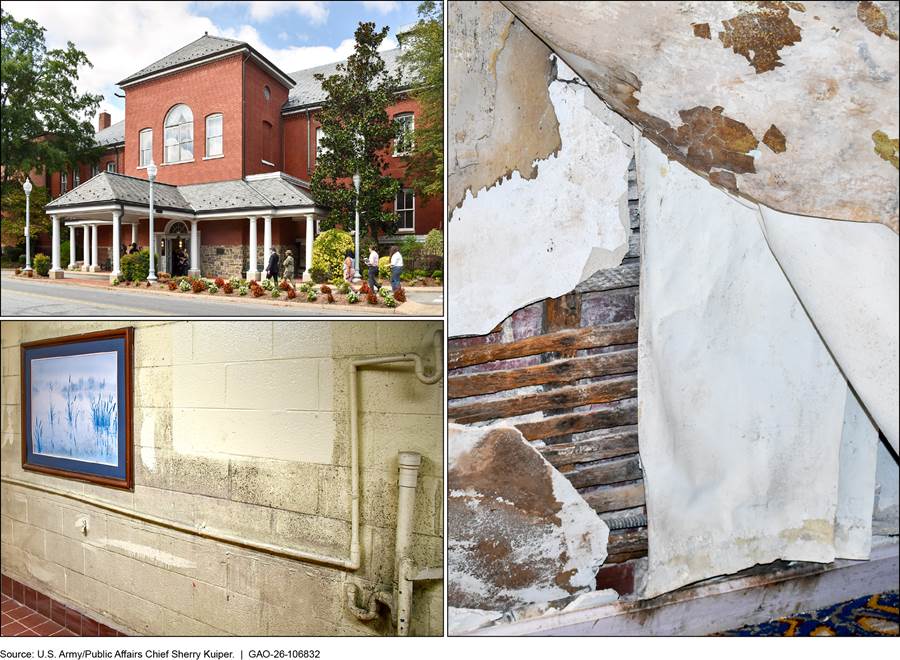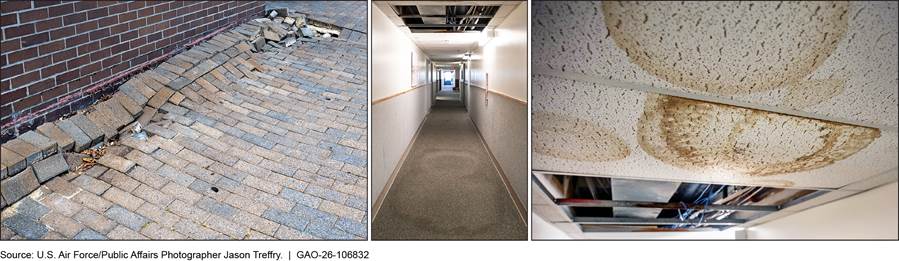 Joint military bases are installations with more than one military service. For example, at Joint Base San Antonio, the Air Force is the lead service, and the Army is the supported service. Eleven of the 12 joint bases received less funding in fiscal years 2018 through 2022 than the Department of Defense’s (DOD) facility sustainment funding goal. However, DOD was unable to obtain data on how this funding was allocated to specific components on joint bases and therefore was unable to determine if the impact of funding below DOD’s goal led to disparities in facility conditions between lead and supported military services on bases. Joint base senior leaders whom GAO surveyed stated that facility management offices do not receive sufficient funding to keep facilities in good working order. During site visits to five joint bases, GAO observed examples of facility degradation due to deferred maintenance (see fig.).