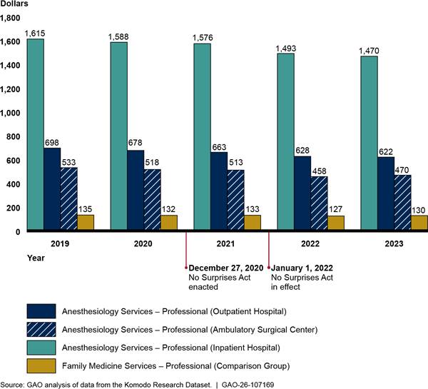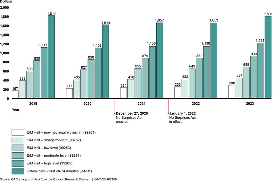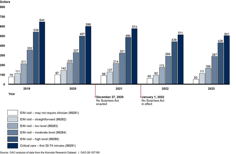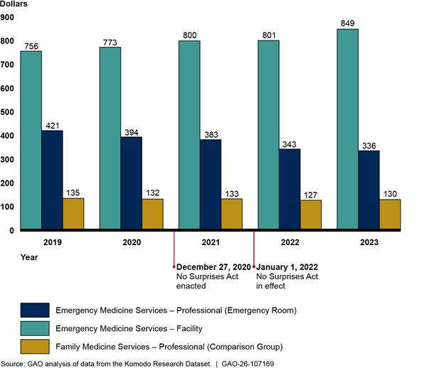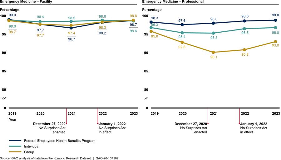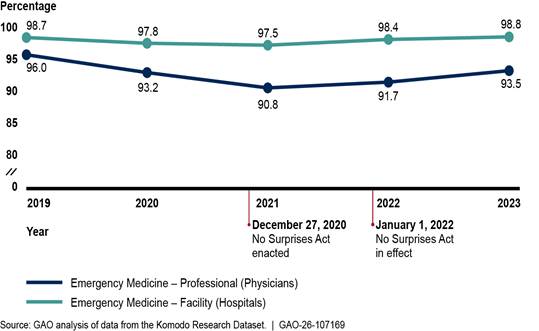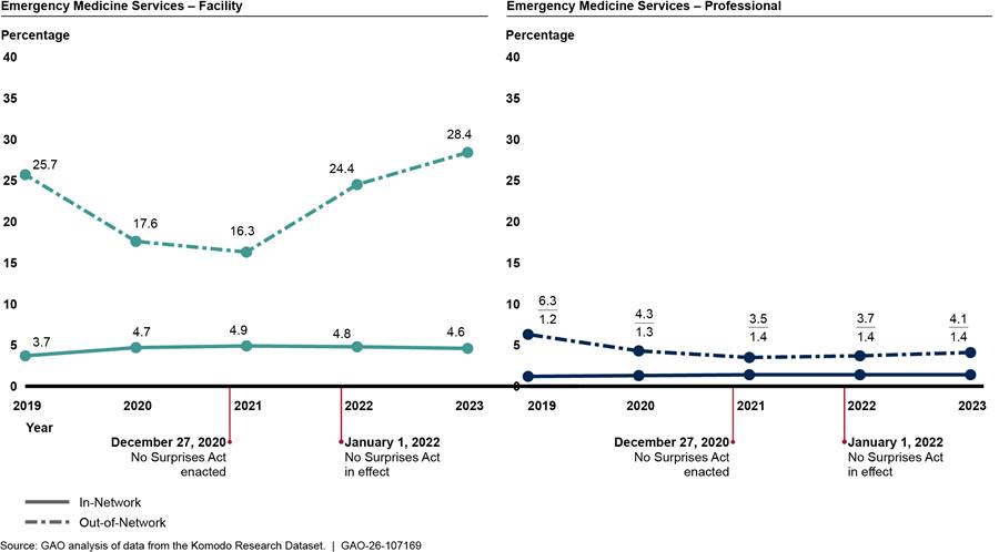 [34]Analysis from the RAND Corporation also found disparities in changes in payment rates for emergency medicine services billed by facilities and physicians. Specifically, RAND found that facility payment rates increased about 19 percent from 2018 through 2022, while professional payments decreased about 7 percent during these years. The study adjusted payment rates for inflation and focused on the three most common evaluation and management emergency medicine services. The analysis did not distinguish between in-and out-of-network services. See “Strategies for Sustaining Emergency Care in the United States,” RAND Corporation, Santa Monica, CA (2025).