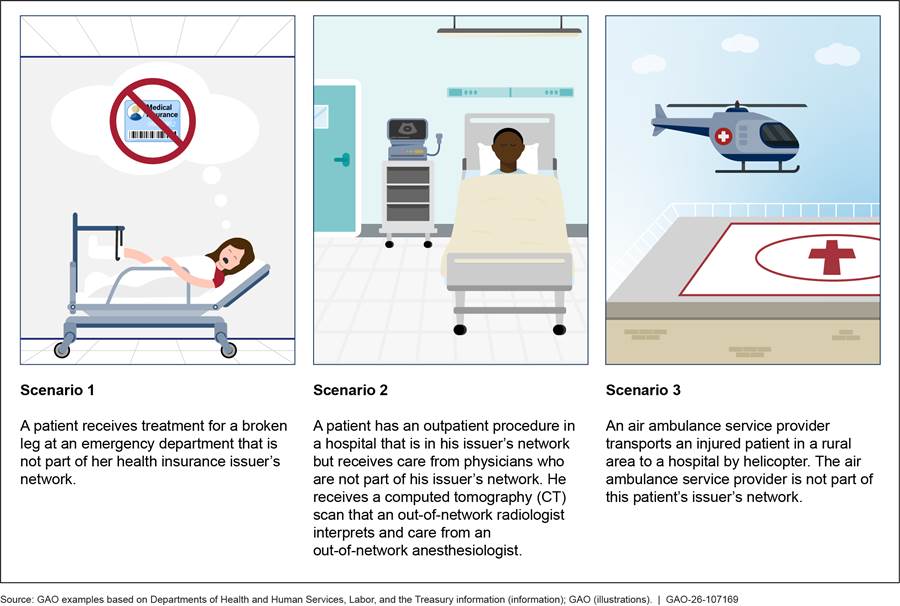 The No Surprises Act generally prohibits health care providers from sending surprise bills for certain out-of-network emergency, non-emergency, and air ambulance services (see fig. 1 for example scenarios covered by the No Surprises Act). The act also established the federal IDR process, which allows issuers and out-of-network health care providers to resolve certain disputes regarding out-of-network payment rates through an arbitration process without involving the patients.[16] The third-party arbitrator that makes a payment determination through the IDR process must consider various factors in making a payment determination.