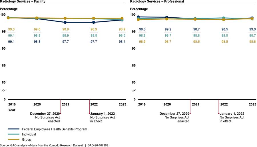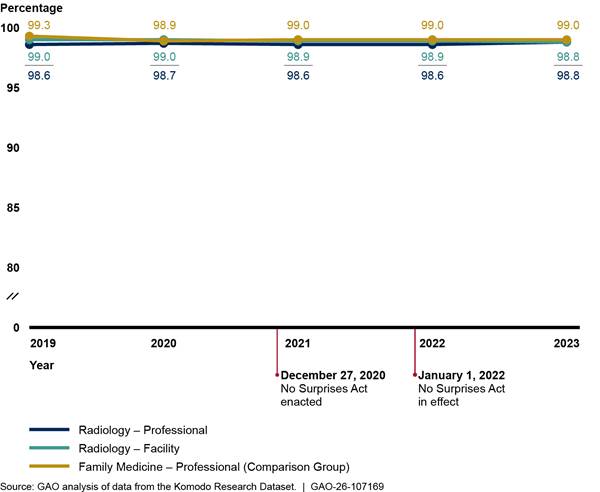 The percentage of in-network facility and professional claims for radiology both remained high and largely unchanged from 2019 through 2023 (see fig. 3). The comparison group of professional family medicine claims remained similarly high and relatively unchanged across the 5 years. See appendix II for additional analyses.