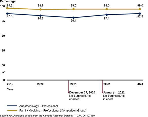 We examined in-network private health insurance claims from 2019 through 2023 and found for three of the four selected specialties—emergency medicine, anesthesiology, and air ambulance—the percentage increased from 2021 to 2023, potentially indicating increases in network participation after the No Surprises Act. Of these three specialties, air ambulance services saw the largest increase in the percentage of in-network claims. While changes overall were mostly modest over these same years, changes were greater for emergency medicine and anesthesiology than for the comparison group of family medicine. Furthermore, any changes in the percentage of in-network claims during this time may be due to factors other than the act, such as the COVID-19 pandemic and consolidation in the health care market.[18]