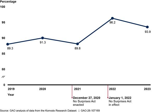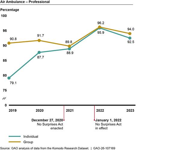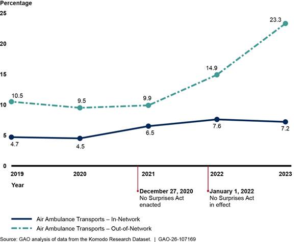 We found that the percentage of in-network professional claims for air ambulance services—including both helicopter and airplane services—changed modestly in the 3 years prior to the No Surprises Act protections taking effect and increased afterward (see fig. 5).[23] We did not compare in-network claims for air ambulance to a comparison group due to the unique nature of air ambulance services. See appendix II for additional analyses.