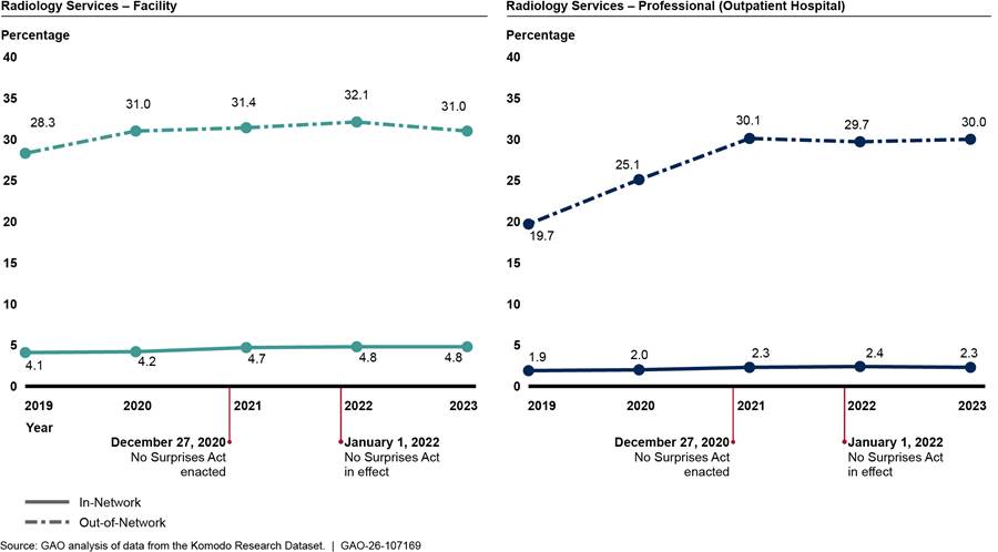 Among specialties likely to be affected by the No Suprises Act protections—emergency medicine, radiology, anesthesiology, and air ambulance—the percentage of in-network claims increased for three of the four specialties after the act took effect. For example, GAO found the percentage of in-network facility claims (typically submitted by hospitals) and professional claims (typically submitted by physicians) for emergency medicine declined before the No Surprises Act took effect, then increased afterward.