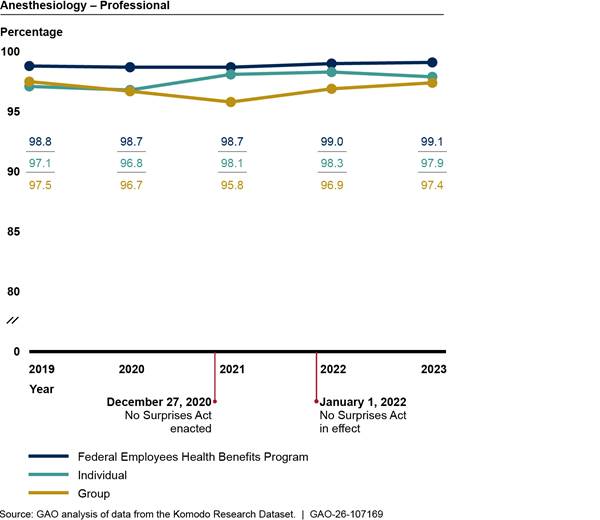 Anesthesiology Claims We analyzed approximately 18 million professional anesthesiology claims from 2019-2023. Professional claims, typically billed by physicians and certified registered nurse anesthetists or their practices, represent most (98 percent) anesthesiology claims in our dataset. Source: GAO analysis of data from the Komodo Research Dataset. | GAO‑26‑107169 |