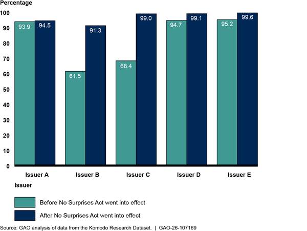 To assess the reliability of the data, we interviewed Komodo Health officials about their data, reviewed relevant documentation, and conducted electronic tests of the data. We determined that the data were sufficiently reliable to provide descriptive statistics on national-level changes in the percentage of in-network claims and payment rates for selected services before and after the No Surprises Act protections went into effect. Limitations of our analysis include that (1) we cannot attribute any changes specifically to the No Surprises Act because other factors, such as the COVID-19 pandemic and health care market conditions, may have affected the percentage of in-network claims and payment rates over this time period, and (2) although the dataset includes some large U.S. issuers and several regional issuers, our results are not generalizable to the entire private market. Furthermore, we determined that we did not have the largest issuers for some states and therefore did not report at the state or local level. See appendix I for more details on the scope and methodology of these analyses.