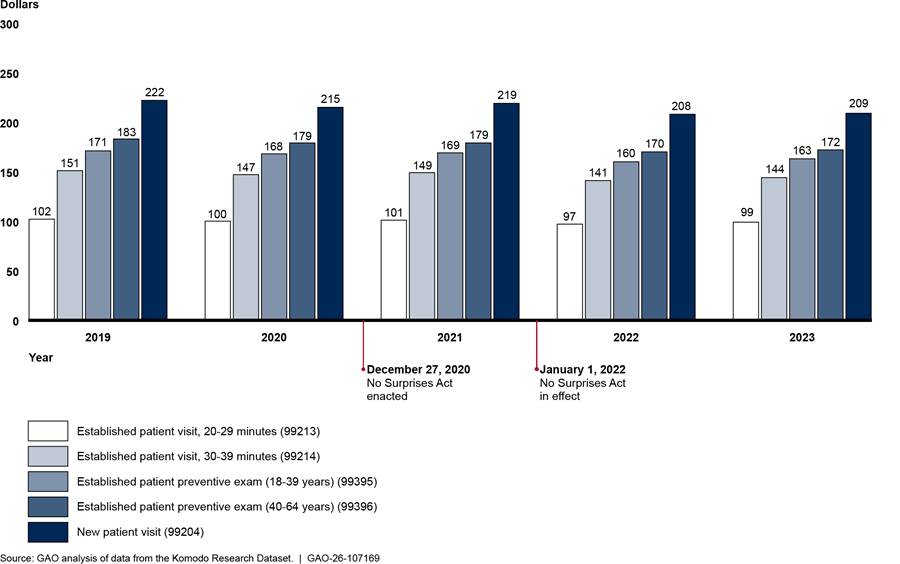 Services were new patient office or other outpatient visit, 45-59 minutes (99204), established patient office or other outpatient visit, 20-29 minutes (99213), established patient office or other outpatient visit, 30-39 minutes (99214), established patient periodic preventive medicine examination,18-39 years (99395), and established patient periodic preventive medicine examination, 40-64 years (99396). These five services represent approximately $10.4 billion in-network expenditures billed through professional claims by physicians or their practices with office as a place of service from 2019 through 2023 in the Komodo Research Dataset. Payment rates are adjusted for inflation to 2023 dollars.