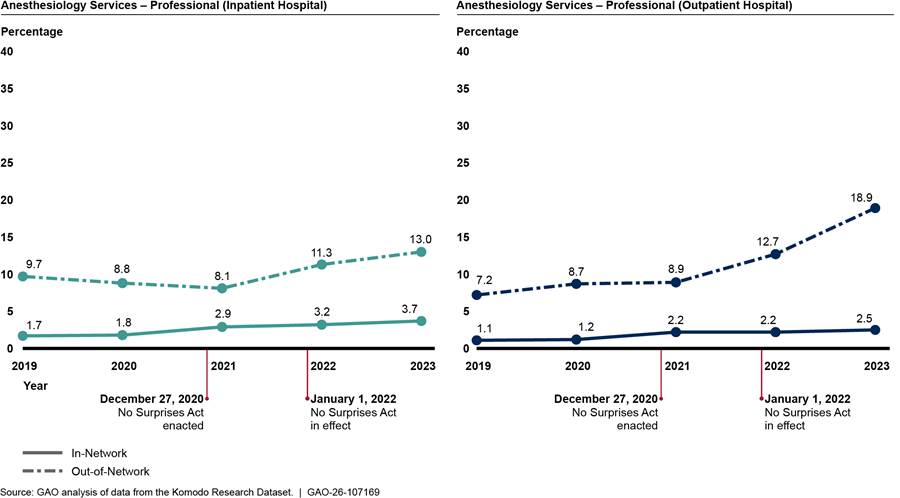 [54]Previous research has also examined trends in in- and out-of-network billing. For examples, see U.S. Department of Health and Human Services, Office of the Assistant Secretary for Planning and Evaluation, Evaluation of the Impact of the No Surprises Act on Health Care Market Outcomes: Exploring Pre-Implementation Trends, Washington, D.C.: Nov. 21, 2024; FAIR Health, “In-Network and Out-of-Network Utilization and Pricing: A Study in Private Healthcare Claims,” New York, NY: Feb. 20, 2024.