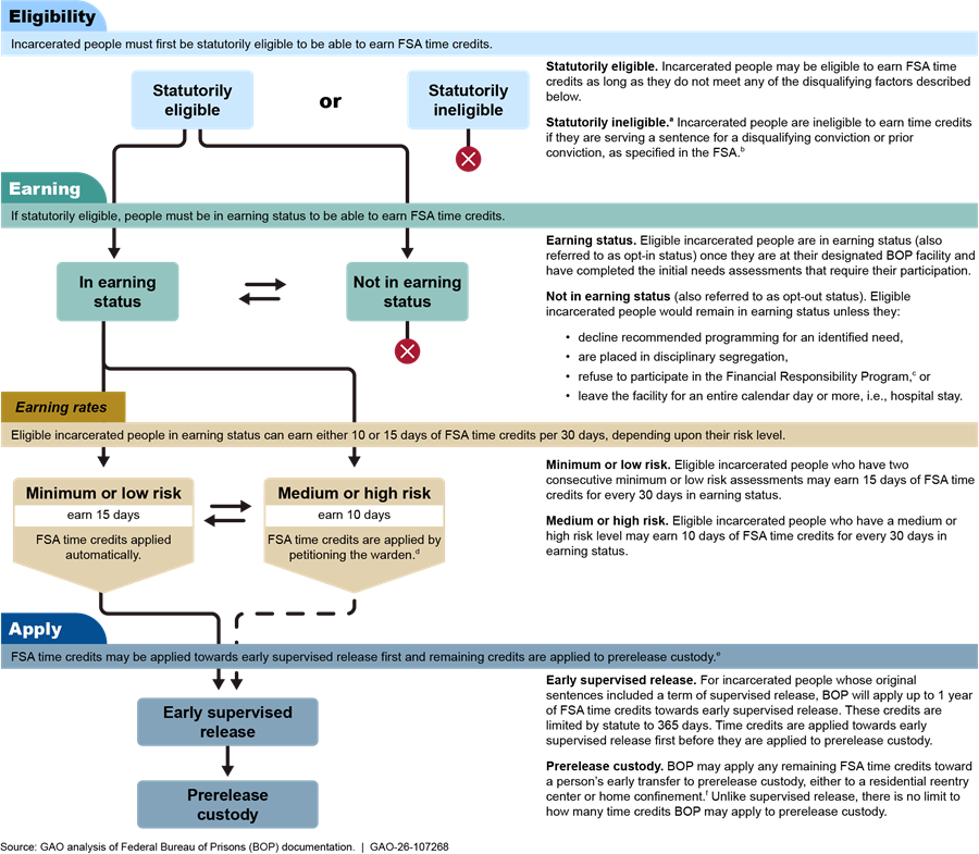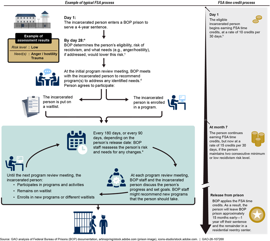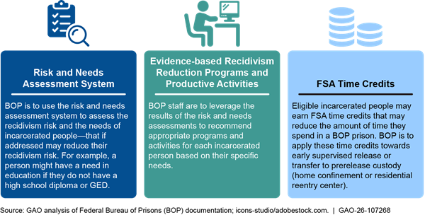 In 2024, BOP released approximately 42,000 people from federal prisons. Approximately 45 percent of people released from federal prison recidivate (are re-arrested or return within 3 years of their release), according to BOP. Under the FSA, BOP is to help reduce recidivism by assessing a person’s recidivism risk and needs and providing programs and activities to address their needs. The FSA allows eligible people to earn time credits that may reduce their time in prison.