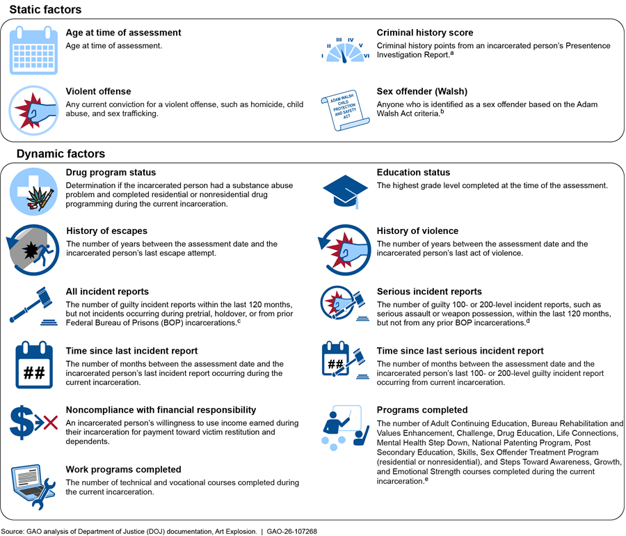 Note: Static factors are characteristics of incarcerated people that are historical and therefore unchangeable, such as an incarcerated person’s age at the time of assessment. By contrast, dynamic factors are variables that may change over time and may reflect more recent incarcerated person behavior, such as prison misconduct or completion of recidivism reduction programs while incarcerated.