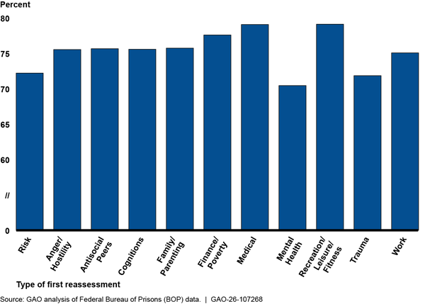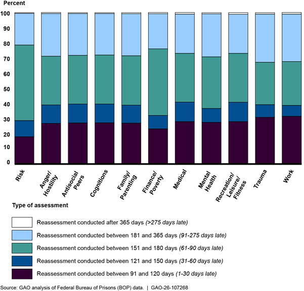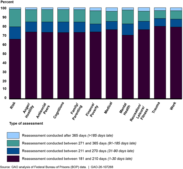 BOP conducted most initial risk assessments and many initial needs assessments within internal time frames. For reassessments, BOP was generally more timely for first reassessments than for second and third reassessments.[38]