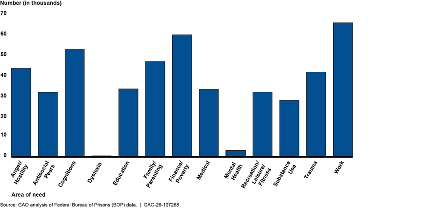 [133]BOP reassesses 12 of the 13 needs for incarcerated people; it does not reassess dyslexia. In addition, we did not include two other needs, education and substance use, because we identified data limitations with the initial assessments.