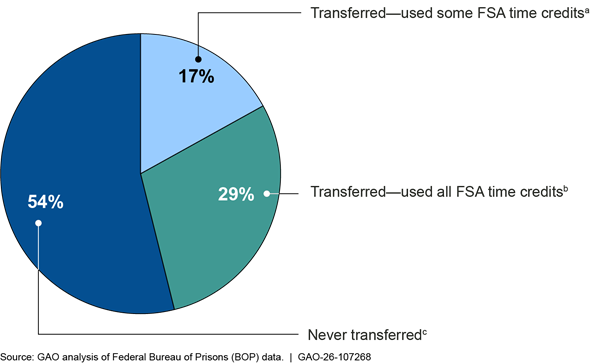 Eligible incarcerated people who agree to participate in programs, among other things, may earn time credits toward early transfer to supervised release and prerelease custody (i.e., home confinement or residential reentry center). GAO found that BOP generally applied all time credits toward supervised release but not for prerelease custody. BOP implemented new planning tools in 2024 and 2025 to help staff anticipate upcoming transfers to prerelease custody and ensure incarcerated people receive their FSA time credits. GAO has ongoing work examining BOP’s efforts to forecast capacity needs and provide sufficient residential reentry center resources.