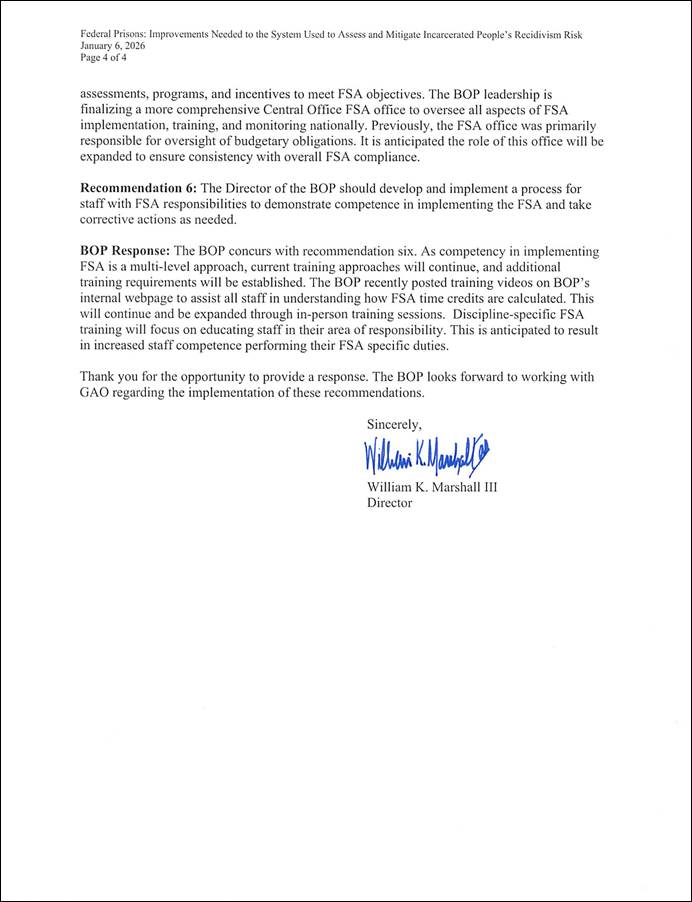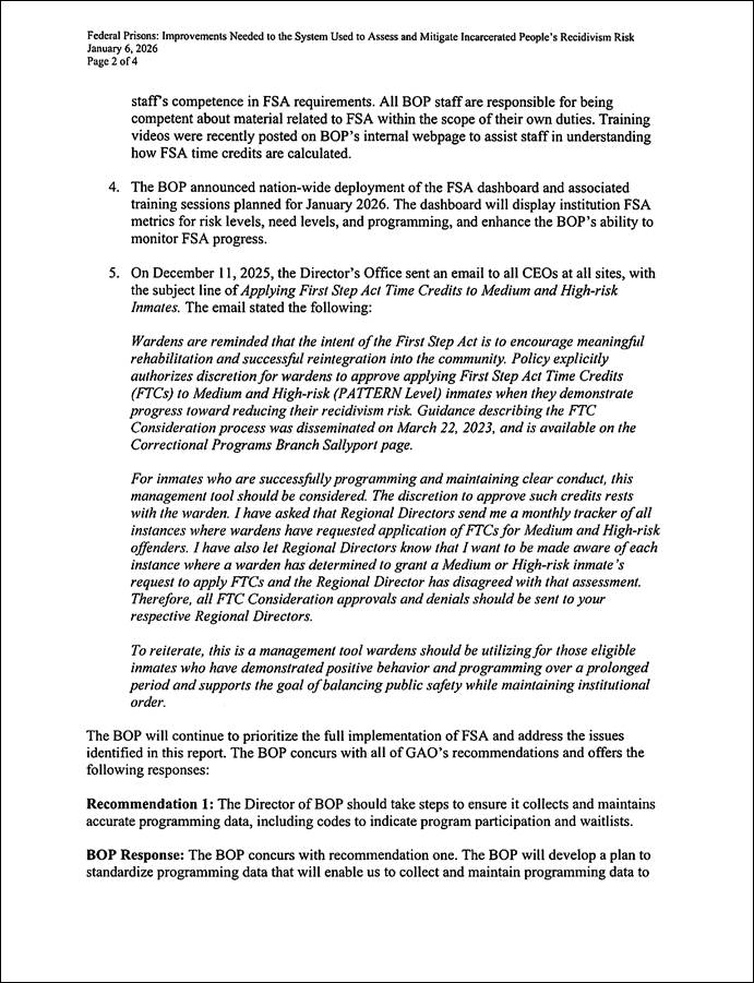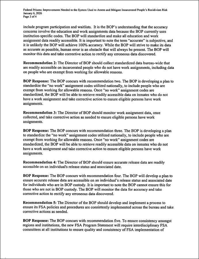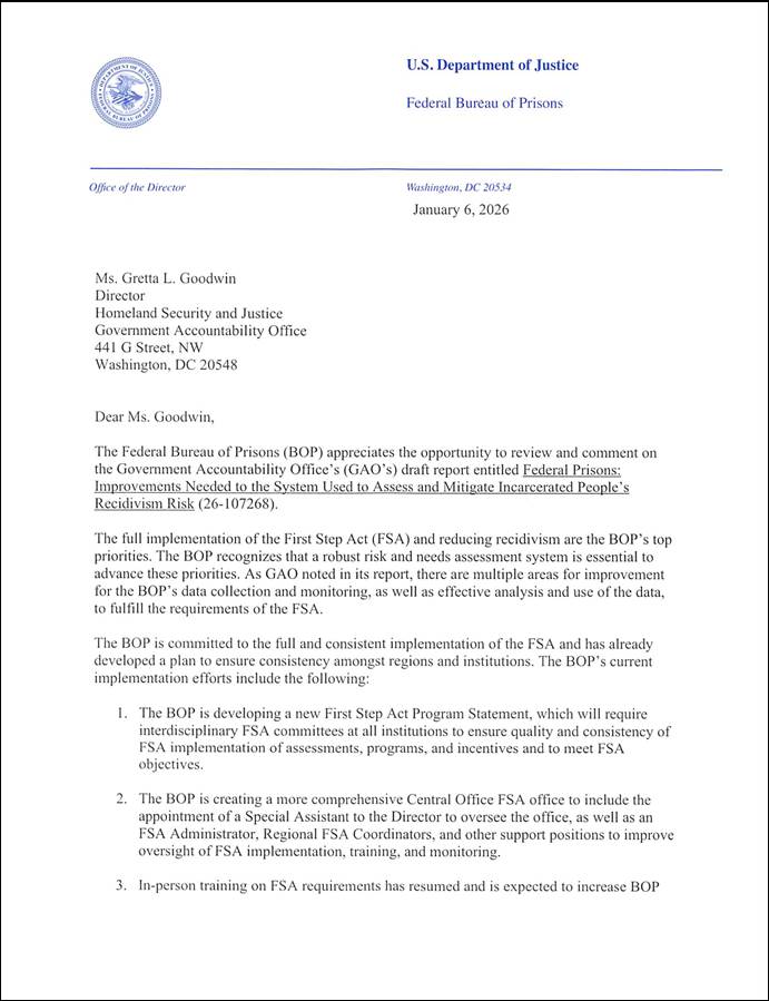 [182]GAO, Federal Prisons: Bureau of Prisons Should Improve Efforts to Implement its Risk and Needs Assessment System, GAO‑23‑105139 (Washington, D.C.: Mar. 20, 2023).