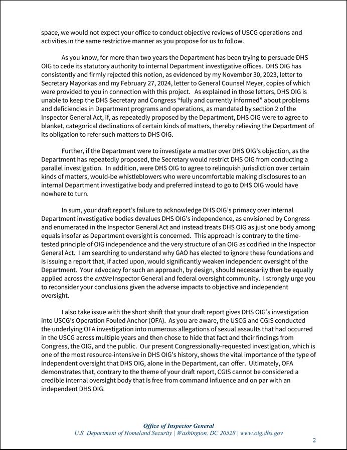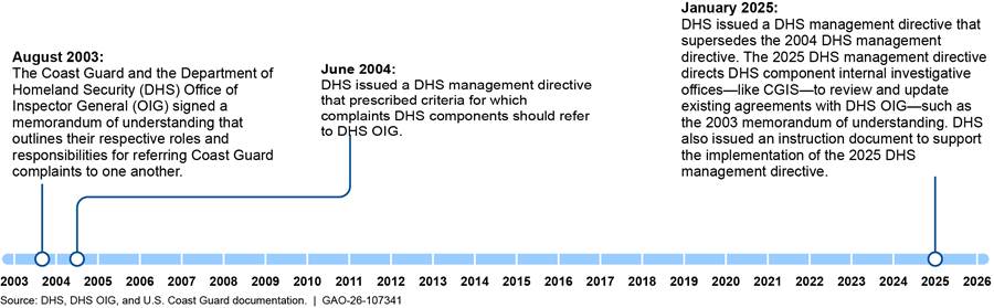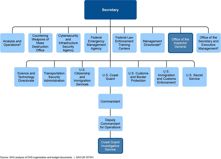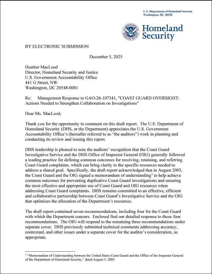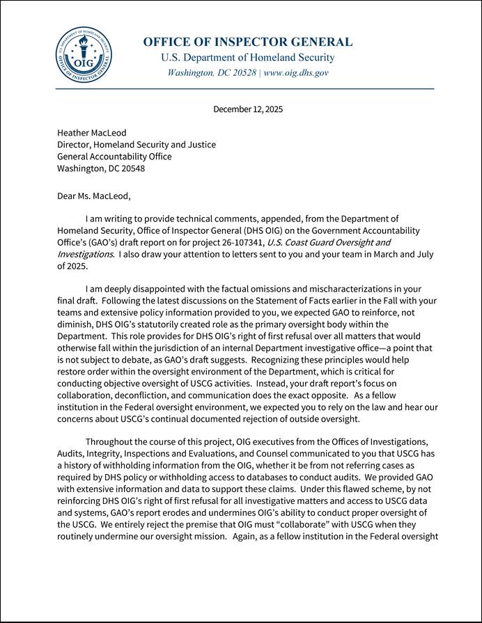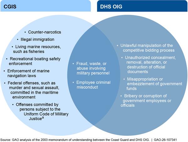[5]Pub. L. No. 117-263, div. K, tit. CXII, subtit. G, § 11271, 136 Stat. 2395, 4065 (2022). This provision also called for GAO to compare the DHS OIG’s oversight structure for the Coast Guard to the DOD and the military service OIGs’ oversight structure for other military services, for which we issued a separate report. See GAO, Coast Guard Oversight: Inspector General Oversight of the Coast Guard and Other Military Services, GAO‑26‑108639 (Washington, D.C.: Jan. 21, 2026).