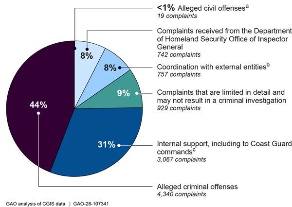 The Coast Guard Investigative Service (CGIS) and the Department of Homeland Security (DHS) Office of Inspector General (OIG) have some overlapping authorities to investigate complaints regarding the Coast Guard. From October 2018 through May 2024, CGIS investigated at least 4,951 such complaints, and DHS OIG investigated 70 such complaints. CGIS is an independent investigative body within the Coast Guard that primarily conducts criminal investigations related to Coast Guard personnel, assets, and operations. DHS OIG investigates complaints of alleged criminal, civil, and administrative misconduct involving Coast Guard employees, contractors, and programs, among others.