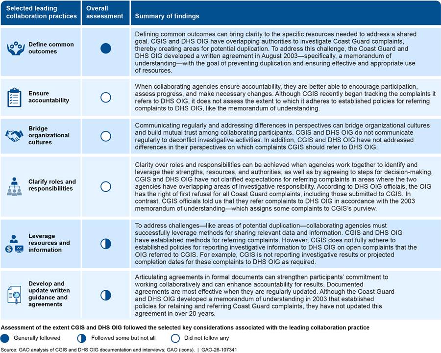[92]See GAO, Government Performance Management: Leading Practices to Enhance Interagency Collaboration and Address Crosscutting Challenges, GAO‑23‑105520 (Washington, D.C.: May 24, 2023). We selected six of the eight leading practices for collaboration because they were the most relevant to CGIS’s and DHS OIG’s activities to receive, retain, and refer Coast Guard complaints. We excluded two practices from our assessment—including relevant participants and identifying and sustaining leadership—because the scope of our review was limited to CGIS and DHS OIG (relevant participants), both of which have established leadership over the offices responsible for overseeing complaints.