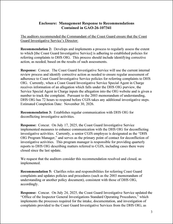 [14]CGIS concurred with all 32 recommendations. According to DHS OIG, CGIS has implemented 29 of the 32 recommendations. It has not implemented three recommendations, including that CGIS should: (1) clarify in policy which complaints CGIS is to refer to DHS OIG and ensure that CGIS refers all requisite complaints; (2) update its investigations manual to comply with Coast Guard requirements for documenting policy; and (3) follow the Coast Guard’s process for coordinating with functional areas when drafting new policies.