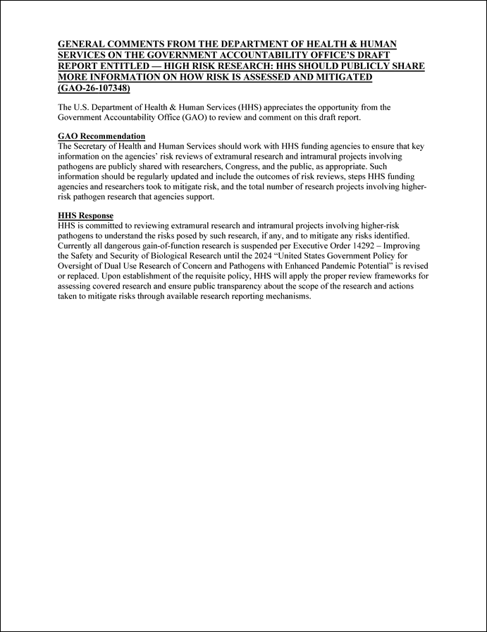 GAO is recommending that HHS ensure that key information on its risk reviews of research involving pathogens are publicly shared, as appropriate, with researchers, Congress, and the public, including steps taken to mitigate risk. HHS neither agreed nor disagreed with the recommendation, but noted it will work in the future to ensure public transparency about the scope of research involving higher-risk pathogens and actions taken to mitigate risks.