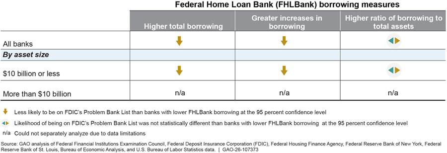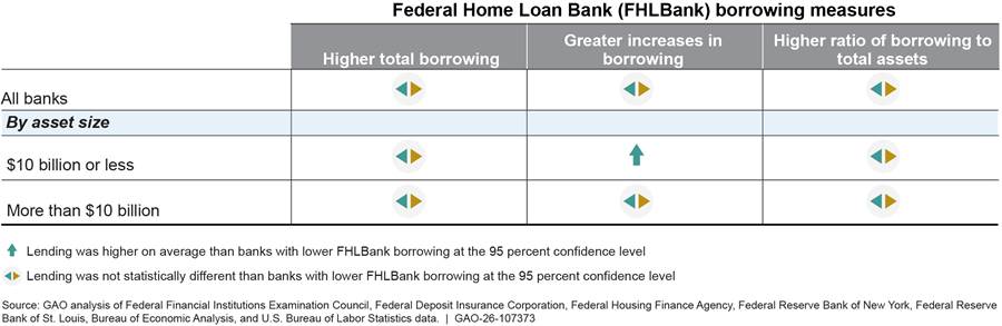 · Outcomes associated with FHLBank borrowing. GAO’s econometric models, which controlled for bank health, macroeconomic factors, and economic cycles, found that higher FHLBank borrowing by a bank was generally associated with positive outcomes for the bank. From 2015 through 2024, higher FHLBank borrowing was associated with (1) increases in real estate lending and (2) lower likelihood of being flagged as a problem bank or of failing or closing voluntarily. These results were largely driven by small banks, which make up 97 percent of banks in GAO’s analysis.