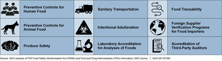 Since 2015, the Food and Drug Administration (FDA) has issued nine rules (regulations) that establish a framework for preventing foodborne illness under the FDA Food Safety Modernization Act (FSMA) enacted in 2011. Separately, FDA has completed most but not all requirements that GAO identified in the law.