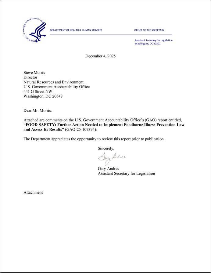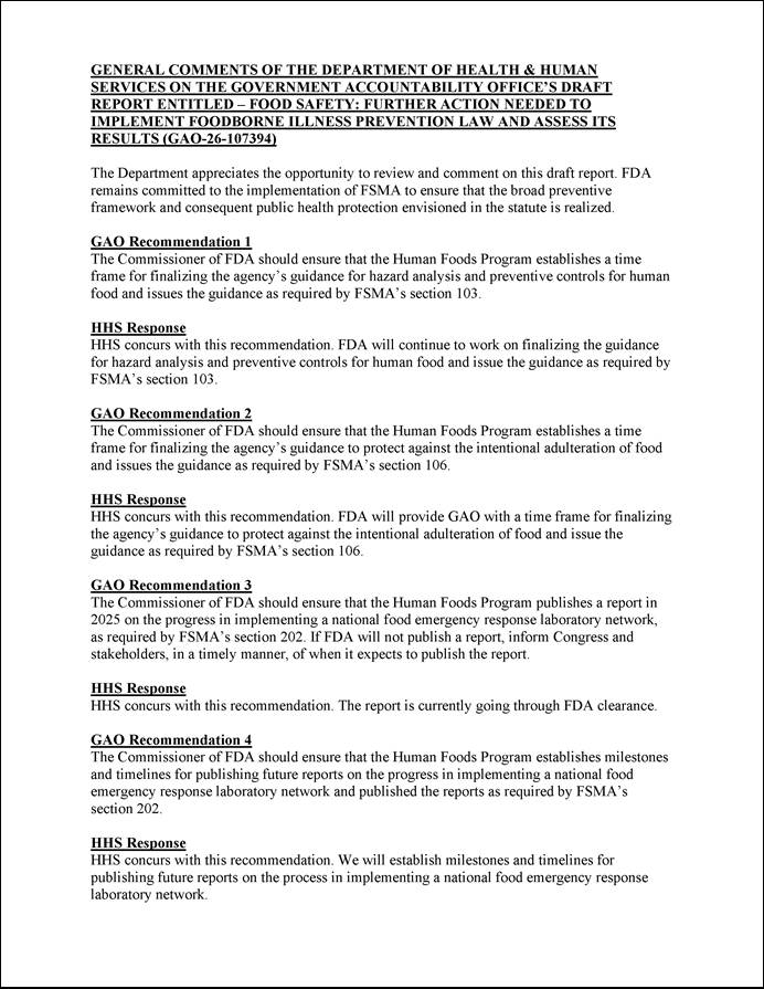 GAO is making seven recommendations, including that FDA take steps to complete requirements included in FSMA, such as issuing guidance, and develop and implement a performance management process to assess whether FDA’s rules have helped prevent foodborne illness. The Department of Health and Human Services concurred with the recommendations.