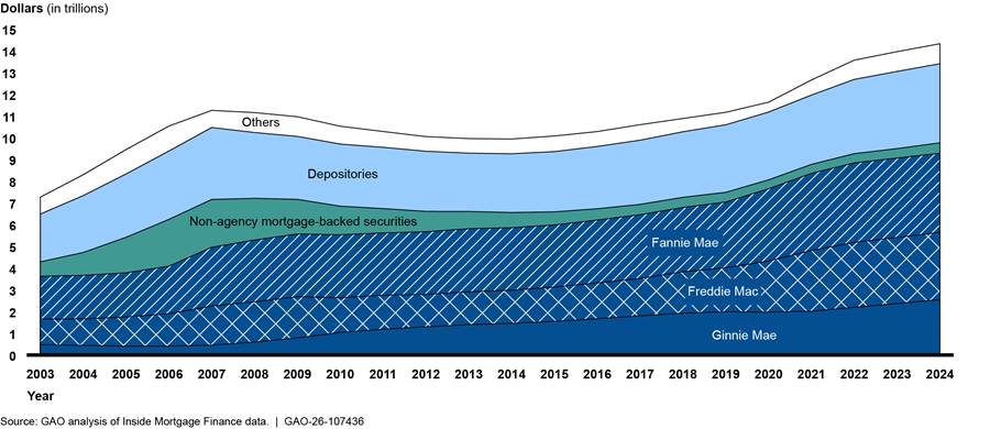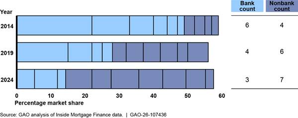 Over the past decade, housing finance increasingly relied on nonbank mortgage companies (nondepository institutions specializing in mortgage lending). Nonbanks now originate and service most loans in the over $9 trillion in securities guaranteed by Ginnie Mae, a government-owned corporation, and by Fannie Mae and Freddie Mac, which are under Federal Housing Finance Agency (FHFA) conservatorship. From 2014 to 2024, the share of such loans serviced by nonbanks grew from 27 percent to 66 percent. But nonbanks have certain risks, such as reliance on short-term credit that may become unavailable during economic downturns. The failure of a large nonbank—or multiple smaller ones—could disrupt mortgage markets and increase federal fiscal exposure.