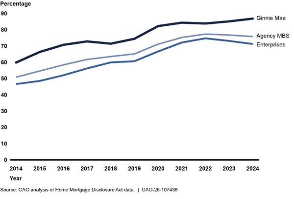 · Origination. Overall, the share of loans (by dollar value) in agency MBS originated by nonbanks rose from 51 percent in 2014 to 76 percent in 2024, according to HMDA data (see fig. 2). In 2024, nonbanks originated 71 percent of loans in enterprise MBS and 87 percent of loans in Ginnie Mae MBS.