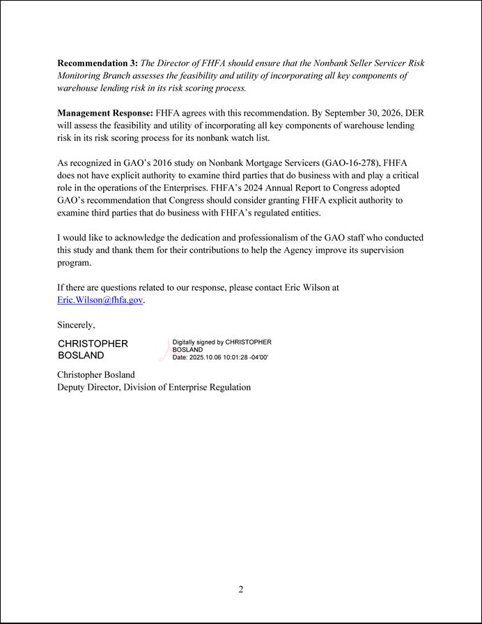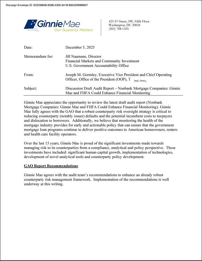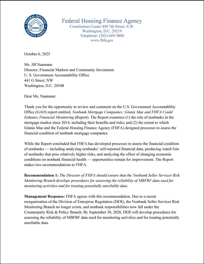 [6]GAO, Nonbank Mortgage Companies: Greater Ginnie Mae Involvement in Interagency Exercises Could Enhance Crisis Planning, GAO‑25‑107862 (Washington, D.C.: Jan. 31, 2025). We recommended that Ginnie Mae develop processes for participating in interagency coordination exercises and for incorporating lessons learned into its strategy for managing nonbank failures. Ginnie Mae neither agreed nor disagreed with the recommendation and had not implemented it as of December 2025.