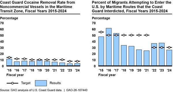 The Coast Guard did not meet the target for its primary drug interdiction performance measure in any of the 10 years from fiscal year 2015 through fiscal year 2024, due in part to longstanding asset and personnel challenges. The Coast Guard also did not meet the target for its primary migrant interdiction measure in 6 of 10 years during that same period. Coast Guard officials stated that these performance measures do not effectively assess its drug and migrant interdiction efforts. As a result, the Coast Guard has implemented new drug interdiction measures that officials said effectively measure its efforts in this area. As of July 2025, Coast Guard officials said the service was in the initial stages of developing new migrant interdiction performance measures and that the new measures had not yet been approved by the Coast Guard or DHS.