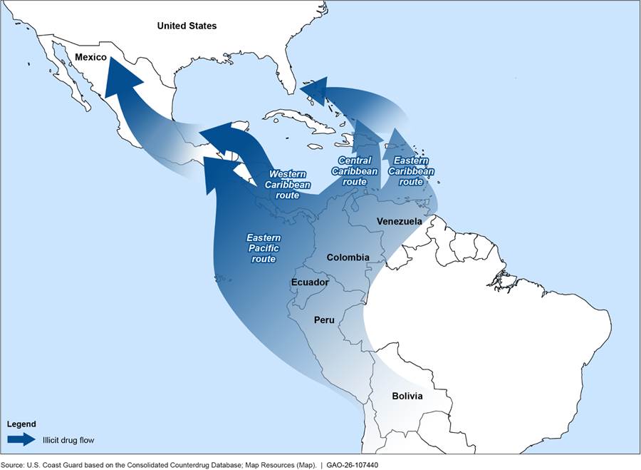 The Coast Guard is a major contributor of vessels and aircraft deployed to disrupt the flow of illicit drugs, including those smuggled from South America to the U.S. through the Western Hemisphere transit zone—a 6 million square mile area of smuggling routes that includes the eastern Pacific Ocean and the Caribbean Sea, as shown in figure 1.