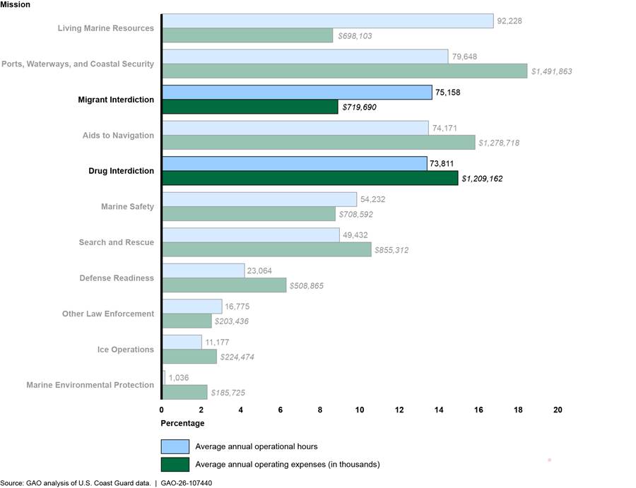 The Coast Guard, a multi-mission military service within DHS, is the lead federal maritime agency responsible for interdicting illicit drug traffic and enforcing U.S. immigration laws and policies at sea.[3] According to the Coast Guard, its presence—vessels, aircraft, and specialized forces—serves as an enforcement mechanism and deterrent to illicit activity that contributes to instability throughout the Western Hemisphere.[4] In fiscal year 2024, the Coast Guard estimated spending approximately $2.6 billion for its drug interdiction and migrant interdiction missions—about 26 percent of its total estimated operating expenses across its 11 statutory missions.[5]