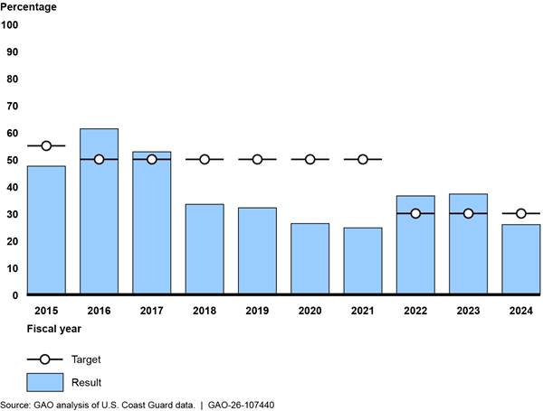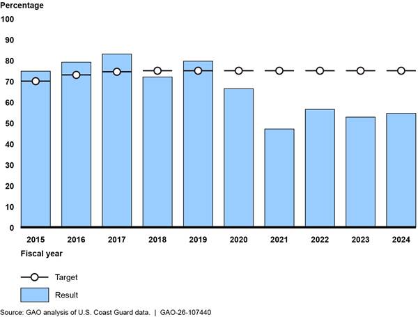 The Coast Guard did not meet the target for its primary migrant interdiction mission performance measure—percent of migrants attempting to enter the U.S. by maritime routes interdicted by the Coast Guard—during 6 of 10 years from fiscal year 2015 through fiscal year 2024.[41] The measure compares the number of migrants the service interdicts to total known maritime migrant flow.[42] According to Coast Guard officials, the service lowered the target during that period to make it more attainable. As a result, according to Coast Guard data, it met the target in fiscal years 2016 and 2017 and 2022 and 2023, as shown in figure 7.