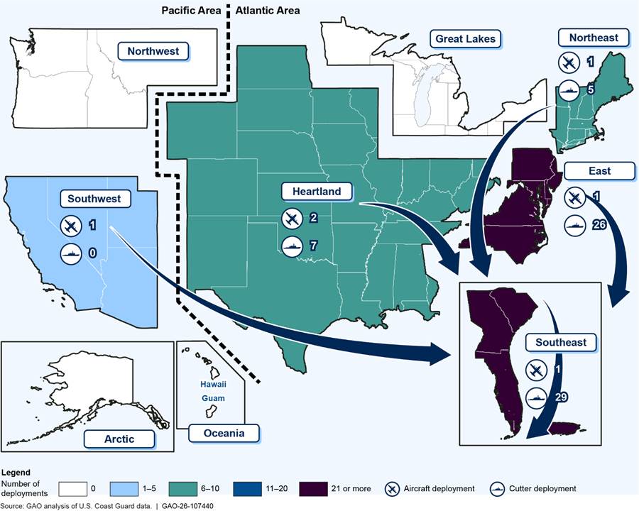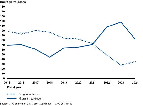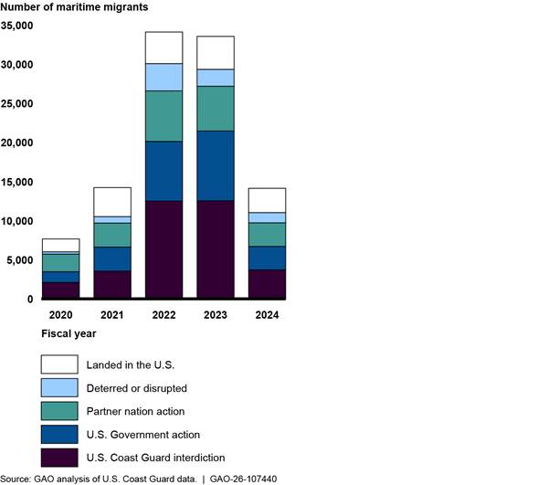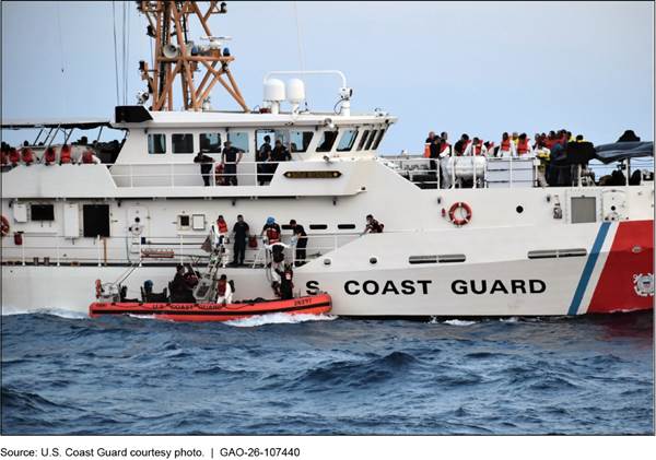 Beginning in 2021, unstable conditions and socioeconomic challenges occurring simultaneously in Haiti and Cuba helped drive the highest maritime migration to the U.S. in over 30 years, according to the Coast Guard. From fiscal year 2022 through fiscal year 2024, almost 70,000 migrants attempted to travel across the Caribbean Sea and Florida Straits, often in unseaworthy or overloaded vessels, to reach the U.S.[1] In response, in August 2022, the Coast Guard, in collaboration with a Department of Homeland Security (DHS) task force, initiated a migrant interdiction surge operation—a high-intensity effort launched on short notice.[2] As of November 2025, the 3-year long surge operation was still ongoing.