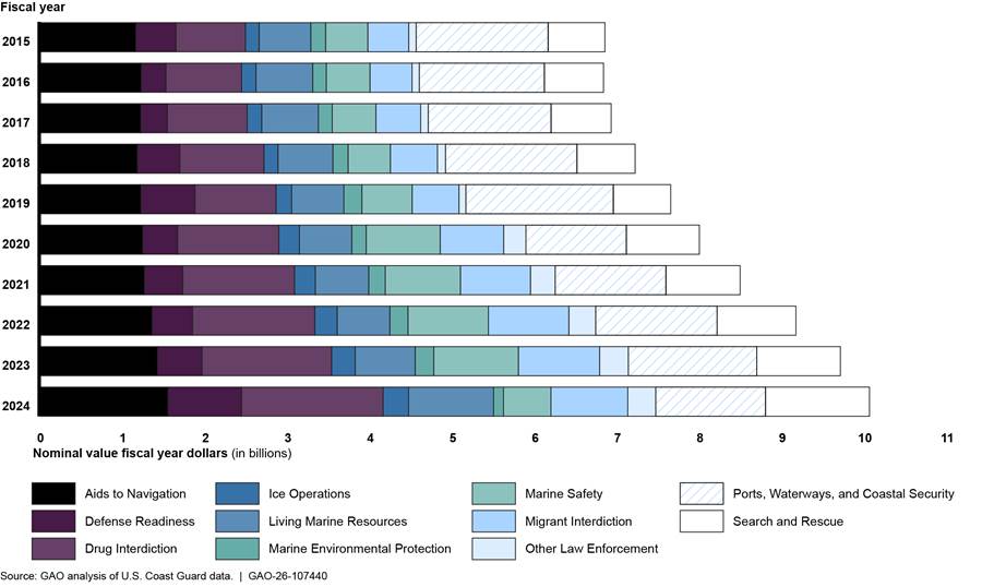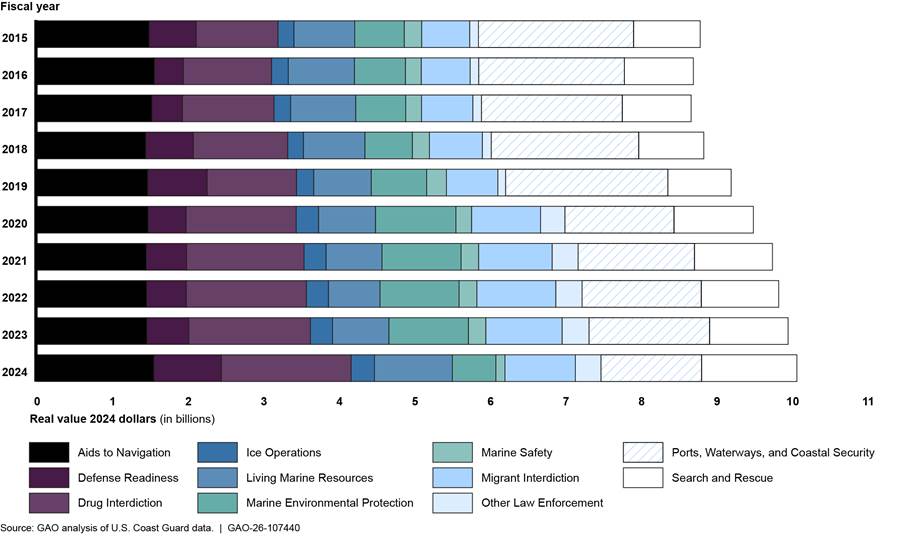 To determine the trends in resources the Coast Guard deployed for its 11 statutory missions in fiscal years 2015 through 2024, we analyzed Coast Guard aircraft and vessel operational hour data for each of its statutory missions during this time.[8] To assess the reliability of these data, we reviewed relevant documentation, conducted electronic testing of the data, and interviewed program officials. We found these data to be sufficiently reliable to report Coast Guard aircraft and vessel operational hours by statutory mission. To determine the Coast Guard’s estimated operating expenses, we analyzed the service’s Mission Cost Model operating expense estimates for its 11 statutory missions.[9] To assess the reliability of these data, we reviewed relevant documentation and written responses from relevant officials. We found these data to be sufficiently reliable to estimate Coast Guard’s operating expenses across its 11 statutory missions.