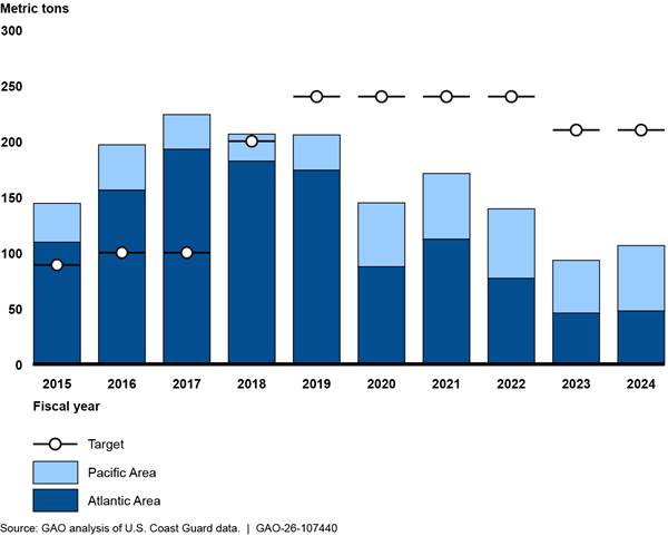 This measure compares the amount of cocaine removed as a result of Coast Guard actions to the total known flow of cocaine through the transit zone.[27] The Coast Guard has another longstanding performance measure for drug interdiction—the metric tons of cocaine removed from noncommercial vessels in the maritime transit zone. According to the Coast Guard, its Office of Maritime Law Enforcement Policy regularly reviews drug interdiction performance and recommends new targets. Officials told us they use historical performance data, anticipated asset availability, and estimated cocaine flow through the transit zone, among other factors, to set targets that Coast Guard considers both attainable and optimistic.[28]
