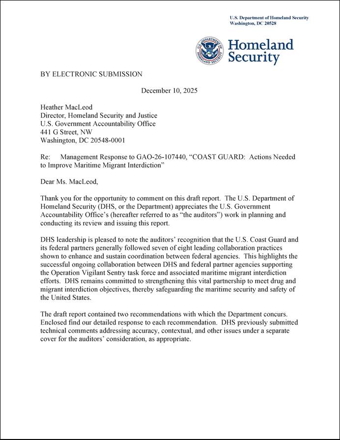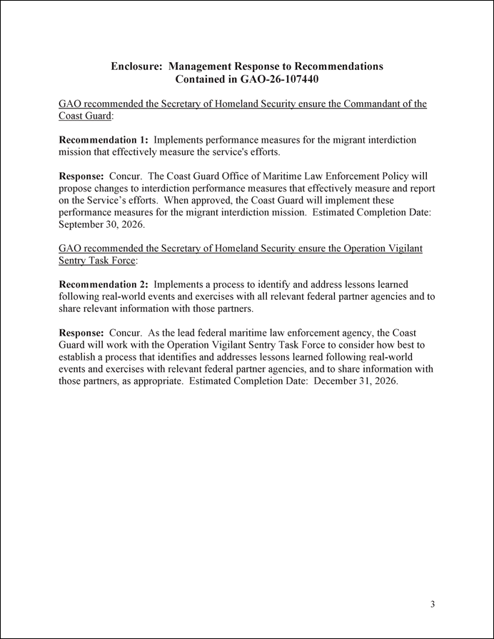 GAO is making two recommendations to DHS to (1) implement new migrant interdiction performance measures for the Coast Guard and (2) implement a process for the Operation Vigilant Sentry task force to identify lessons learned from events and share related reports with all relevant federal partners. DHS concurred with both recommendations.