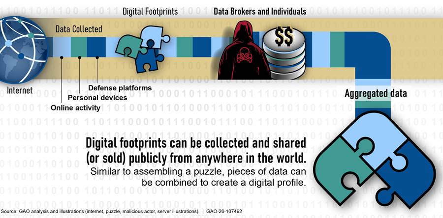 Advances in technology have made the accessibility to this information easier and more efficient. Specifically, data generated by personnel and defense platforms—also known as digital footprints—can be gained through public websites, stolen and posted on the dark web, or acquired and sold by data brokers from anywhere in the world.[1] These digital footprints, when aggregated into a digital profile, can threaten military operations; the privacy and personal safety of service members, civilian employees, contractors, and family members; and ultimately our national security.