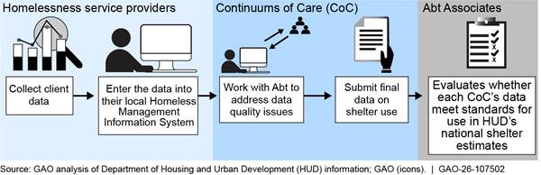 GAO was asked to review how HUD collects and analyzes data on people experiencing sheltered homelessness. This report (1) describes HUD's process for estimating the number and characteristics of people who use shelter programs, (2) examines HUD’s process for assessing data quality and creating estimates, and (3) assesses HUD’s efforts to address data quality issues that may affect those estimates.