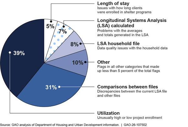 In 2022, the most common category of flag, accounting for 39 percent, was related to project utilization, which indicates unusually high or low enrollment (see fig. 2). A CoC could receive this flag if, for example, it reported no people enrolled in a shelter during the reporting period.