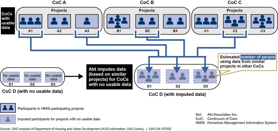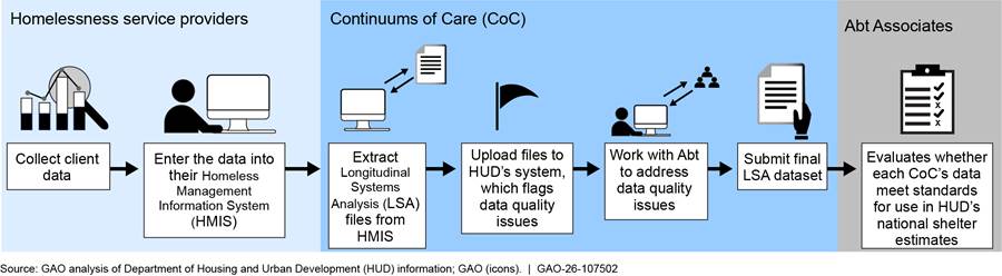 The Department of Housing and Urban Development (HUD) reports national estimates of the number and characteristics of people using homeless shelters. These estimates are based on data from about 400 Continuums of Care (CoC), which are planning bodies that coordinate homelessness services within a defined geographic area. CoCs manage shared databases that service providers in their area use to collect data on the people they serve. Each year, CoCs submit aggregated data from these databases to Abt Associates, a consulting firm that processes and analyzes the data for HUD. Abt works with CoCs to identify and resolve data quality issues and determines whether the data meet HUD’s standards (see figure). For CoCs with unusable data and shelters that do not collect data, Abt uses statistical methods to generate estimates.