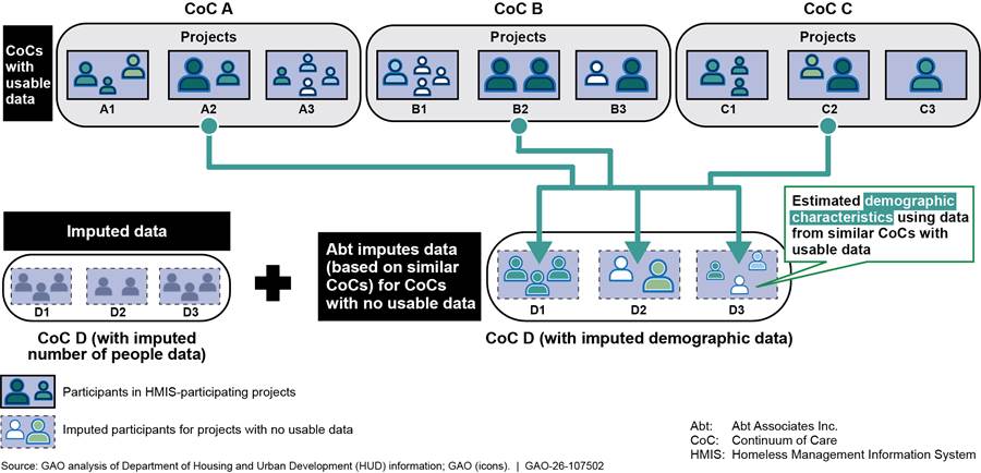 After imputing the number of people who used shelter programs at CoCs with unusable data or in nonparticipating projects, Abt creates statistical “weights” to estimate their demographic characteristics. These weights are based on the demographic characteristics of people who used shelter programs at similar CoCs with usable data (see fig. 5). Abt identifies similar CoCs on the basis of a variety of characteristics, including the percentage of people in different geographic areas and race and age categories, and the percentage who are veterans or chronically homeless.[23] For CoCs without usable LSA data, Abt staff said they use the annual Point-in-Time count and other data sources to identify these CoC characteristics.
