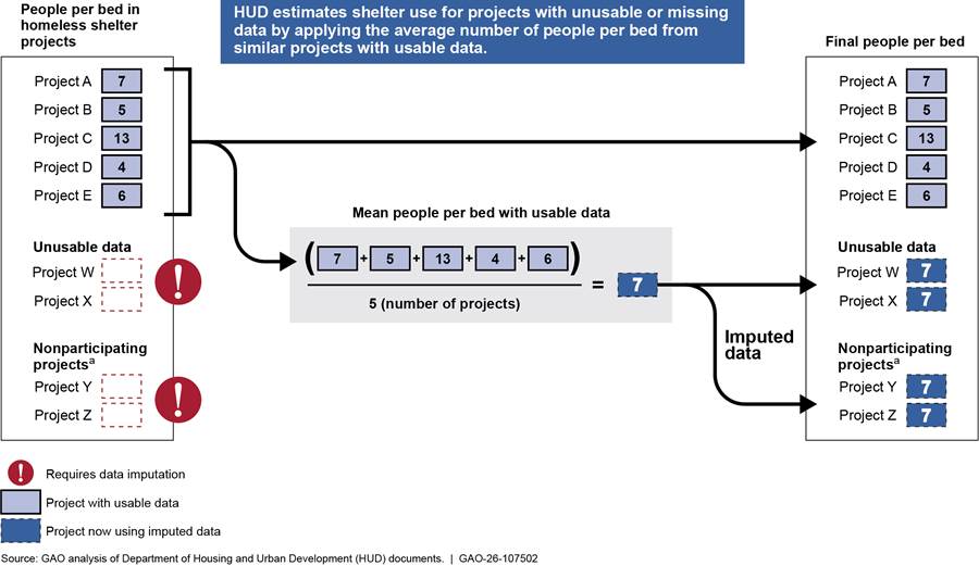 Abt uses statistical techniques to impute—that is, to estimate and replace—missing or unusable data. These imputations cover both CoCs without usable LSA data and shelter projects that do not participate in HMIS. Abt first identifies comparable projects with usable data. It does so using four factors: project type, household type, geographic area (rural, suburban, or urban), and whether the project had more than the median bed count for similar projects.[22] Next, Abt calculates the average number of persons per bed across the comparable projects and multiplies that average by the bed count of each project that did not have usable data, which is taken from the Housing Inventory Count (see fig. 4).