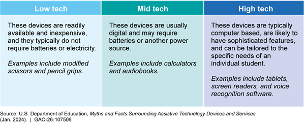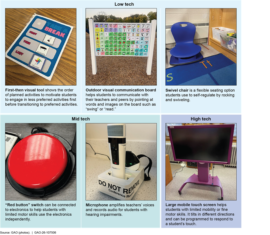 Figure 3: Examples of Low-, Mid-, and High-Tech Assistive Technology Devices Used in Selected School Districts GAO Visited