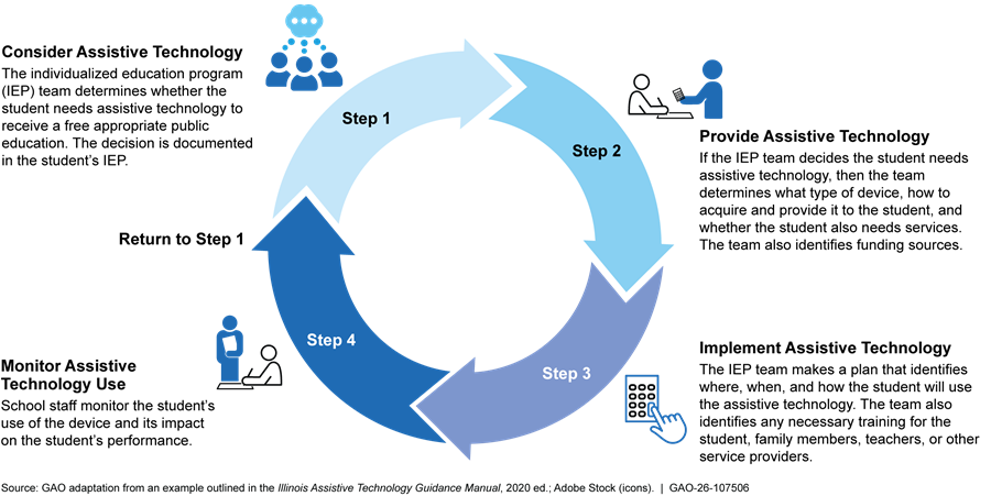 The Individuals with Disabilities Education Act (IDEA) requires that all children with disabilities receive a free appropriate public education (FAPE) that includes special education and related services that are designed to meet their unique needs.[2] During the 2022–23 school year, 7.5 million students ages 3 to 21—or 15 percent of all public school students—received special education services under IDEA.[3] Under IDEA, assistive technology must be considered for students receiving special education services. However, little is known about how this requirement is implemented locally. In January 2024, the U.S. Department of Education (Education) published guidance to dispel misconceptions about assistive technology, signaling that there may be confusion about what assistive technology is and what IDEA requires.