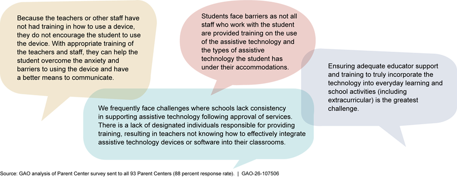 Families of students with disabilities may also have limited knowledge about assistive technology, according to staff from nearly all of the school districts we visited and two-thirds of the Parent Centers that responded to our survey. For example, staff from one school said families are often interested in getting a device for their child and assume the child will know how to use it on their own. However, in some instances, families are not sufficiently trained on how to use a device, and as a result the child does not use the device at home. Parent Centers—technical assistance centers funded by Education—shared similar observations (see fig. 4). For example, 67 percent of Parent Centers that responded to our survey indicated that when discussing assistive technology, families always or often reported challenges accessing information about what assistive technology may be best for their child.