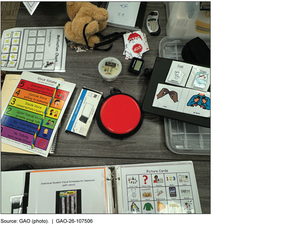 · Communication cards and visual aids. Staff from one school district said that students use communication cards with images of activities (e.g., snack, bathroom, or break). Students can express what they would like to do by pointing to an image. Staff from this school district said they also use visual schedules (e.g., “first you do this, then you…”), which can help students regulate their behavior by sharing what activities come next.