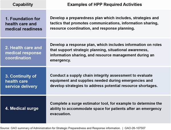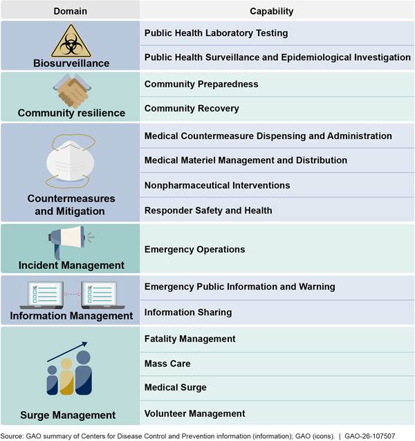[38]See U.S. Department of Health and Human Services, Centers for Disease Control and Prevention, Public Health Emergency Preparedness and Response Capabilities: National Standards for State, Local, Tribal, and Territorial Public Health (Oct. 2018) and Assistant Secretary for Preparedness and Response, 2017-2022 Health Care Preparedness and Response Capabilities (Nov. 2016).